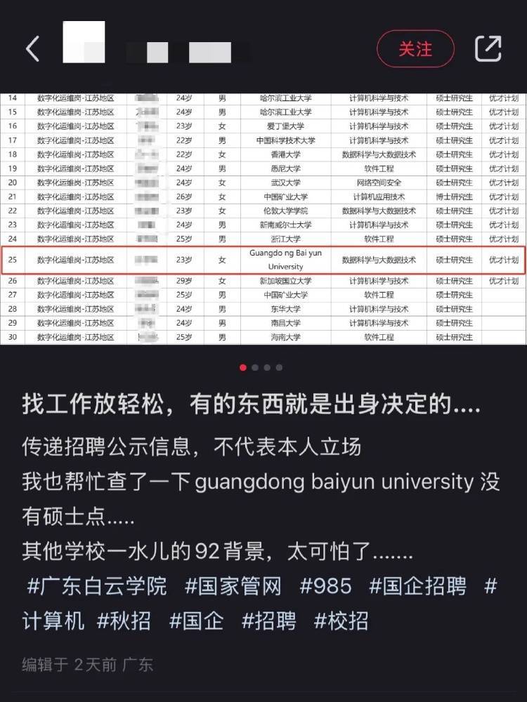 正在新闻消息,10月30日,有网友发帖称,国家管网集团“2025年高校毕业生招聘东部原油储运公司面试人员公示名单”中,有一位入围面试人选毕业院校为广东白云学院,学历为硕士研究生。
