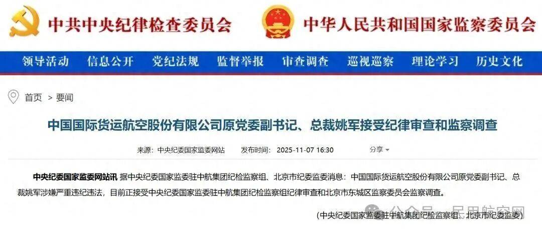中央纪委国家监委网站11月7日通报,中国国际货运航空股份有限公司原党委副书记、总裁姚军涉嫌严重违纪违法,目前正接受中央纪委国家监委驻中航集团纪检监察组纪律审查和北京市东城区监察委员会监察调查。